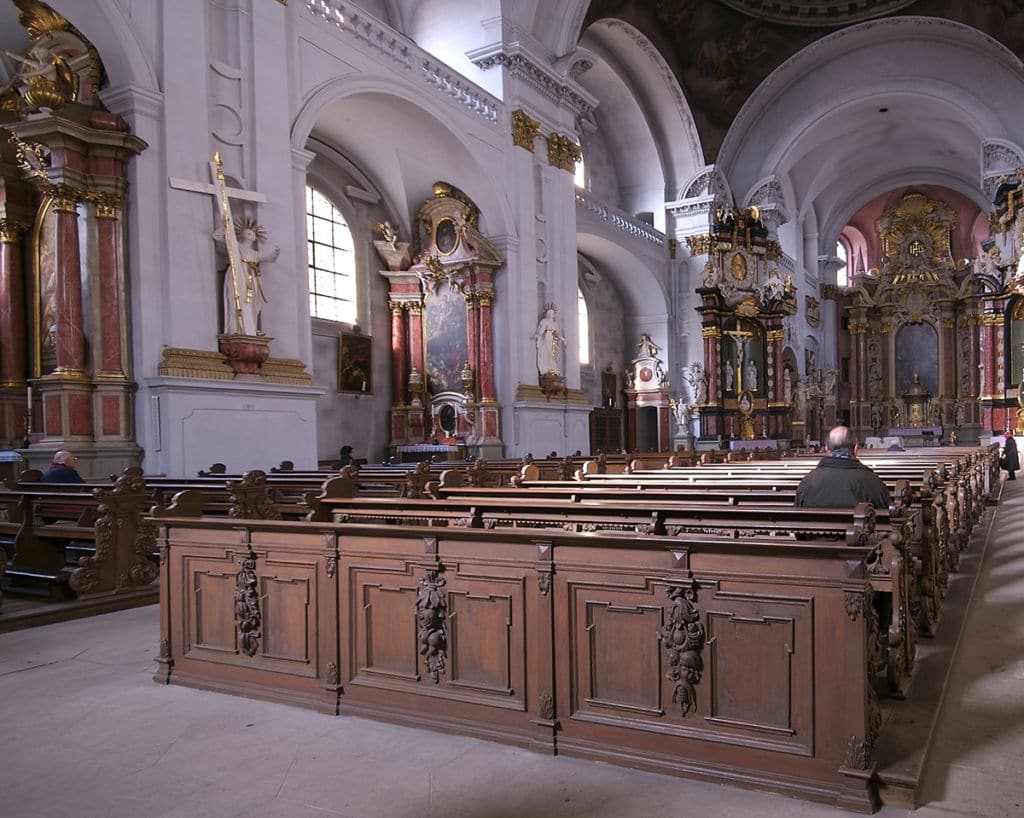 Im Inneren der Kirche findet man im Altarraum Gemälde von Oswald Onghers. Diese zeigen die Ordenheiligen Ignatius von Loyola und Franz Xaver.